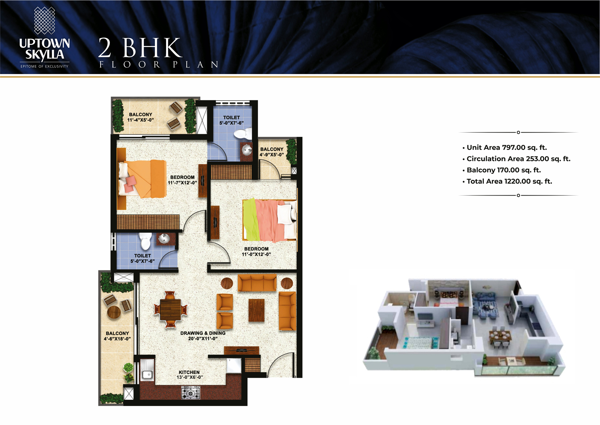 | 2 BHK | 797 sq.ft | 170 sq.ft | 253 sq.ft | 1220 sq.ft. | ₹ 88,93,800 |