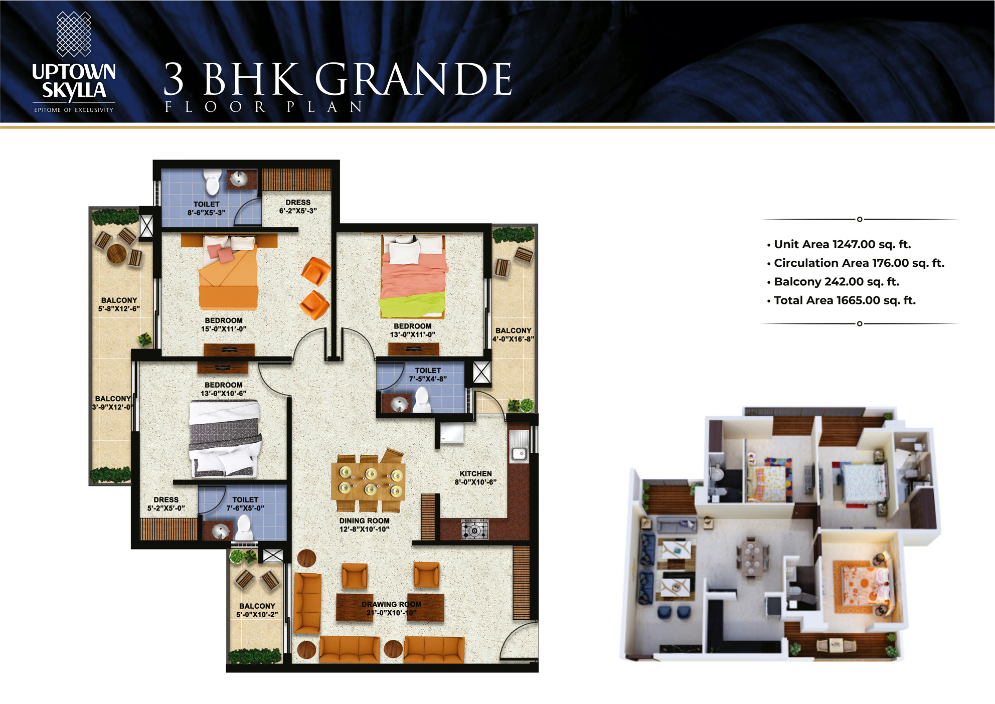 | 3 BHK Grande | 1247 sq.ft | 242 sq.ft. | 176 sq.ft | 1665 sq.ft. | Sold Out |