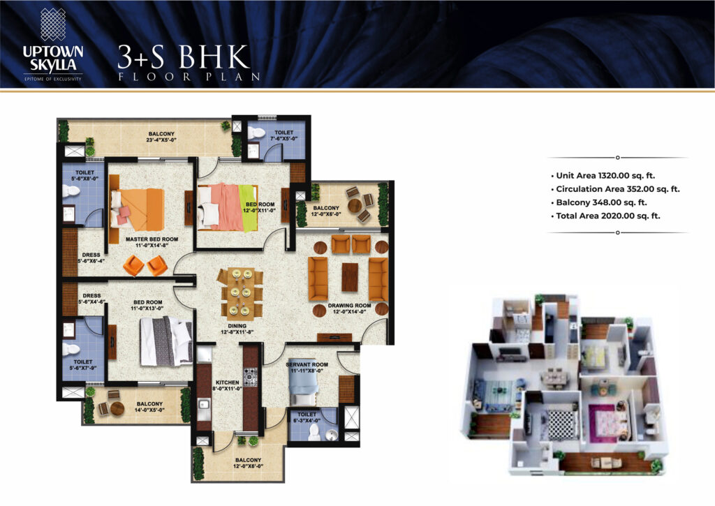 | 3 + S BHK | 1320 sq.ft | 348 sq.ft. | 352 sq.ft | 2020 sq.ft. | ₹ 1,51,29,800 |